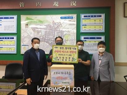 ▲ [사진제공 = 이천시]마장면에 위치한 사단법인 동심(대표 이상율)과 에듀가든(대표이사 송수진)에서 창전동행정복지센터를 방문해 마스크(1,000매)를 전달했다.