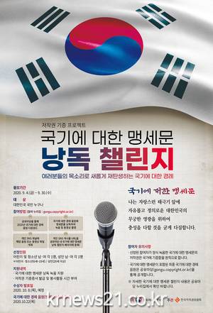 ▲ [사진=홍보포스터]문화체육관광부(장관 박양우, 이하 문체부)는 한국저작권위원회(위원장 임원선, 이하 위원회)와 함께 9월 4일(금) 제3회 지식재산의 날을 맞이해, 고(故) 이교숙 작곡가 유족이 저작권을 기증하고, 해군군악대가 연주해 새롭게 탄생한 ‘국기에 대한 경례’ 음원을 최초로 공개한다. 아울러 국기에 대한 맹세문 낭독 참여 잇기(챌린지) 행사를 진행한다.