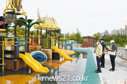 정하영 김포시장이 9월 준공을 앞 둔 김포한강신도시 마산동 마리미공원 물놀이장을 31일 현장 점검했다.