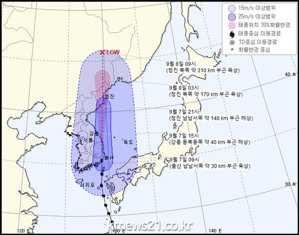 한편, 하이선은 이날 오전 9시 부산 동북동쪽 약 50㎞ 부근 해상까지 올라가고 오후 3시에는 강릉 동쪽 약 60㎞ 해상까지 접근할 것으로 예상되고 있다.