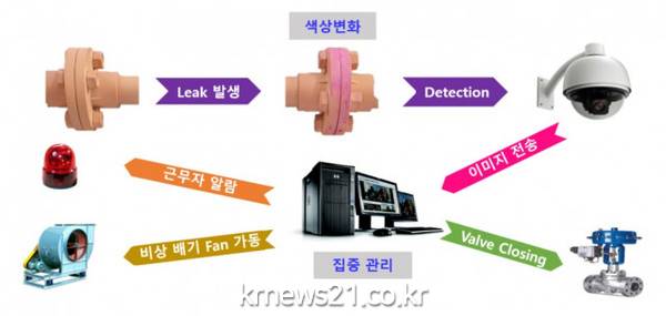 이번에 개발한 ‘산/알칼리 화학물질 누출 조기감지’ 기술은 화학물질과 접촉할 경우 화학반응을 일으켜 색이 변하는 유해물질 반응 도료를 통해 누출을 실시간으로 감지할 수 있는 것이 특징이다. 도료는 순수 국내 기술로 개발했으며 산/알칼리/중성 화학물질의 누출을 동시에 감지할 수 있다.