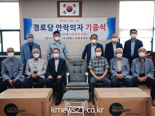 진천군노인회 박승구 회장은 “지역 어르신들에게 관심과 사랑을 보내주신 이 사장님께 감사드린다”며, “기증받은 의자는 관내 경로당과 건강가정 다문화지원센터에 전달할 예정”이라고 말했다.