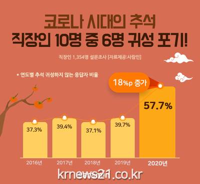 특히, 이들 중 70%는 올 추석 귀성하지 않기로 선택하는데 코로나19가 직접적인 영향을 미쳤다고 답했다.