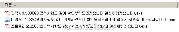 이번에 발견된 랜섬웨어는 ‘이력서_200824(경력 사항도 같이 기재하였으니 확인부탁드릴께요 열심히 하겠습니다 감사합니다)’, ‘입사지원서_20200907(경력사항도같이기재되어있습니다 참고바랍니다 열심히하겠습니다)’ 등 제목을 사용해 채용 지원 문서로 위장했다.