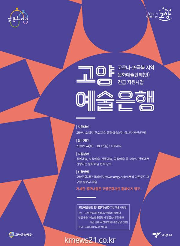 코로나-19로 인한 예술활동의 제약으로 어려움을 겪는 지역 문화예술 단체와 예술인을 위해 고양문화재단(이사장 이재준)과 고양시가 긴급 지원사업을 펼친다.