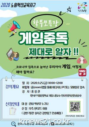 ▲ [사진=홍보포스터]서울 노원구(구청장 오승록)가 게임중독 자녀를 두거나 게임중독 예방에 관심이 있는 학부모들을 대상으로 ‘자녀의 게임중독과 학부모의 역할’이란 주제로 강의를 개최한다고 밝혔다.
