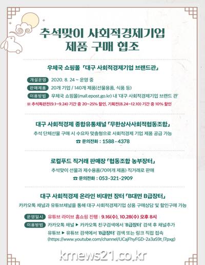 ▲ [사진=홍보포스터]대구시는 코로나19로 어려움을 겪고 있는 지역경제의 활성화와 함께다가오는 추석을 맞아 실속과 의미를 모두 챙길 수 있도록 취약계층 일자리 창출을 위해 노력하는 사회적경제기업 할인 특판전을 연다.