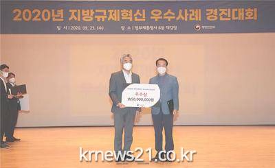 ▲ [사진제공 = 부산시]부산시(시장 권한대행 변성완)는 어제(23일) 세종정부청사 대강당에서 개최된 행정안전부 주관 「2020년 지방규제혁신 우수사례 경진대회」에서 우수상과 장려상을 받았다고 밝혔다.