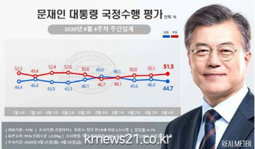 여론조사전문기관 리얼미터가 YTN 의뢰로 지난 21일부터 25일까지 5일간 전국 성인 남녀 2511명을 대상으로 조사한 결과 문 대통령의 국정 수행에 대한 지지율(긍정평가)은 전주 대비 1.7%포인트 하락한 44.7%로 나타났다.