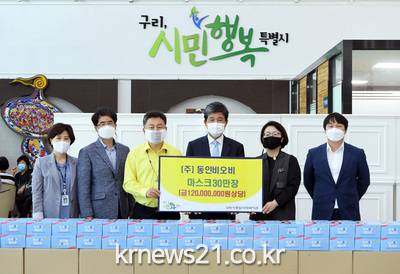 구리시(시장 안승남)는 28일 안승남 구리시장, 안영호 ㈜동인비오비 대표, 이상희 구리시종합사회복지관장 등 관계자 8명이 참석한 가운데, ㈜동인비오비(대표 안영호)에서 후원한 덴탈 마스크 30만장을(1억2천만원 상당) 구리시종합사회복지관(관장 이상희)에 전달했다고 밝혔다.