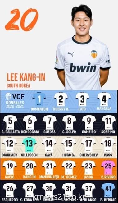 발렌시아 구단은 7일(한국시각) 공식 홈페이지를 통해 2020-2021시즌 선수단 등번호를 확정, 발표했다. 이강인은 올 시즌 들어 바뀐 등번호 '20번'을 그대로 유지했다.
