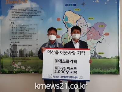 이혁렬 ㈜에스폴리텍 대표는 “많은 양은 아니지만 지역 주민들의 코로나19 감염 공포를 조금이나마 해소하는데 보탬이 되고자 마스크 기탁을 결정했다”며 “어려운 시기이지만 이웃들이 힘을 내서 이 위기를 슬기롭게 극복하길 바란다” 고 전했다.