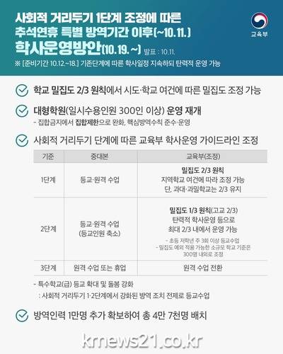 유 부총리는 "학사 일정 조정 학교가 이제 20여개 수준으로 안정됐으며 학생·교직원 코로나19 확진자도 10월 들어 현저하게 줄어 안정세를 유지하고 있다"며 "원격 수업이 길어지면서 벌어진 학습 격차 완화를 위해 대면 수업이 늘어나야 한다는 학교 현장 요구를 적극적으로 반영했다"고 설명했다.