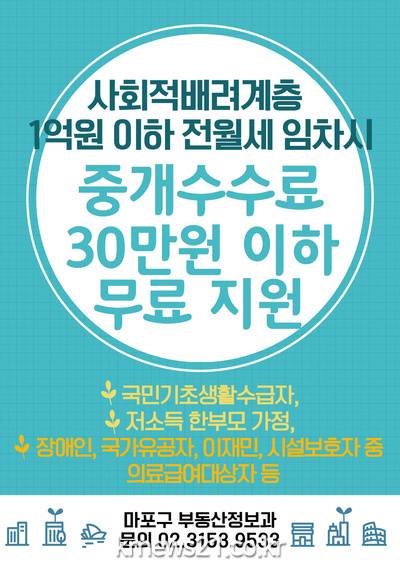 ▲ [사진=홍보포스터]마포구(구청장 유동균)는 더불어 사는 나눔문화의 확산과 저소득 주민의 주거생활 안정성 향상을 위해 ‘사회적배려계층을 위한 무료중개 지원사업’을 확대해 시행하고 있다고 밝혔다.