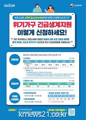 긴급생계지원금 대상자는 코로나19로 인해 가구 소득이 25% 이상 감소하고, 가구원 전체소득의 합이 기준 중위소득 75% 이하이며, 대도시 기준 재산이 6억 원 이하인 가구다.