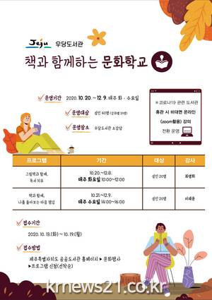 ▲ [사진=홍보포스터]제주시 우당도서관(관장 김철용)에서는 코로나19 시대에 심신이 지쳐있는 제주시민이 책을 함께 읽으며 건강한 독서 및 독후활동 지원을 위해 성인 및 어린이 대상으로‘책과 함께하는 문화학교’를 운영한다.