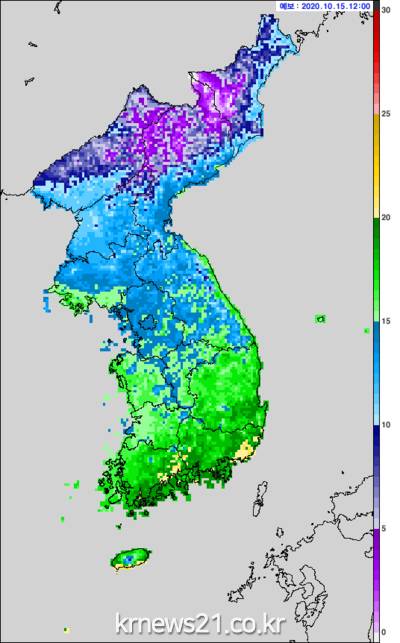 ▲ [이미지출처 = 기상청 홈페이지]오늘(15일) 아침 기온은 올 가을 들어 가장 춥겠다. 일부 지역에서는 최저 기온이 0도 이하로 내려가며 서리가 내리는 거나 얼음이 어는 곳도 있겠다.이 많아 쌀쌀하겠다.