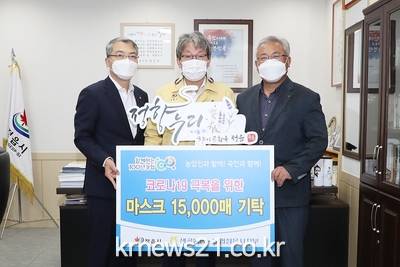 정읍시지부 이용균 지부장과 샘골농협 허수종 조합장은 14일 정읍시청을 방문해 900만원 상당의 KF94 마스크 15,000매를 전달했다.