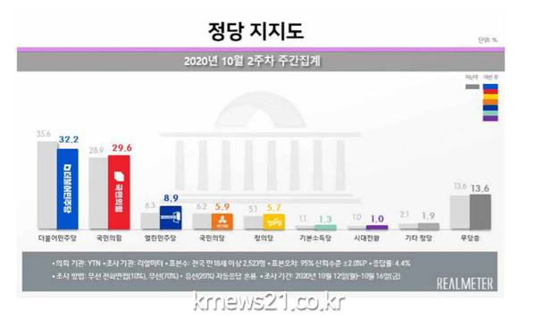 라임·옵티머스 사태의 반사 이익으로 국민의힘 지지율은 0.7%포인트 올라 29.6%를 기록했다. 이에 따라 민주당과 국민의힘 지지율 격차는 2.6%포인트로 2주 만에 다시 오차범위(95% 신뢰수준에 ±2.0%포인트) 안으로 들어왔다.