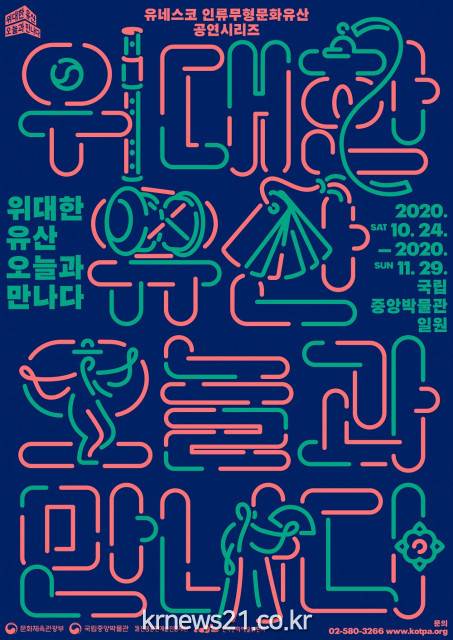 ▲ [사진=홍보포스터]문화체육관광부(장관 박양우)가 주최하고 전통공연예술진흥재단(이사장 정성숙)과 국립중앙박물관(관장 배기동)이 주관하는 2020 유네스코 인류무형문화유산 시리즈 ‘위대한 유산, 오늘과 만나다’가 10월 24일(토)부터 11월 29일(일)까지 온·오프라인에서 동시에 열린다.
