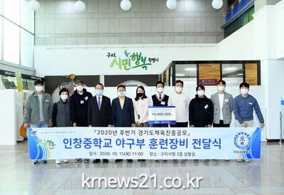 ▲ [사진제공 = 구리시]구리시(시장 안승남)는 지난 15일 구리시청 3층 상황실에서 체육회 고문인 안승남 구리시장, 강예석 구리시체육회 회장 등 관계자 10명이 참여한 가운데, 경기도체육회 2020 후반기 경기도 체육진흥 공모사업 선정에 따른 ‘인창중학교 야구부 훈련 장비 전달식’을 가졌다.