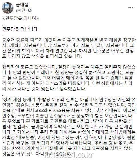 금 전 의원은 전날(20일) 자신의 SNS에 '민주당을 떠나며'라는 제목의 글을 올렸다. 해당 게시글에는 "더 이상은 당이 나아가는 방향을 승인하고 동의할 수 없는 지경에 이르렀다"며 "마지막 항의의 뜻으로 충정과 진심을 담아 탈당계를 낸다"는 내용이 담겼다.