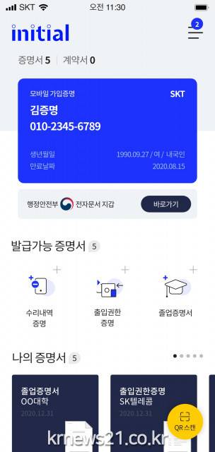 SKT는 행정안전부와 지속 협업해 30여종의 전자증명서를 ‘이니셜’ 앱에서 직접 발급받을 수 있는 기능도 선보일 계획이다.