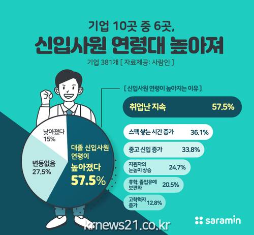 구인구직 매칭 플랫폼 사람인(대표 김용환)이 기업 381개사를 대상으로 ‘신입사원 연령 변화’를 조사한 결과, 10곳 중 6곳(57.5%)이 신입사원의 연령이 ‘높아졌다’고 밝혔다.