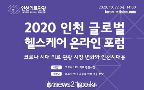 ▲ [사진=홍보포스터]인천광역시(시장 박남춘)와 인천관광공사(사장 민민홍)는 코로나시대 세계 의료관광 시장 변화에 따른 인천시 대응방안을 모색하기 위하여 국내외 의료관광과 웰니스 분야의 전문가를 초청하여 “인천 글로벌 헬스케어 온라인 포럼”을 개최한다고 밝혔다.