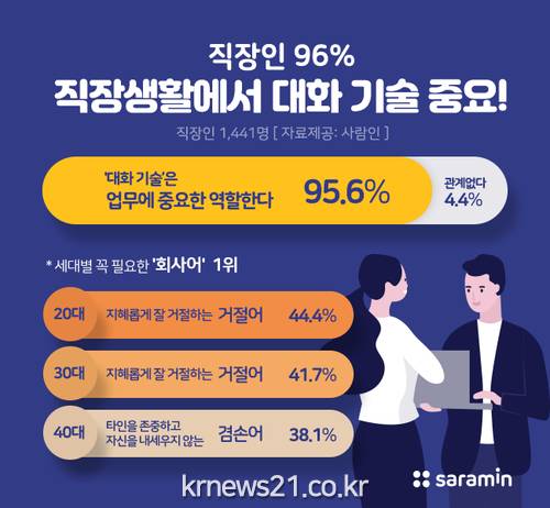 구인구직 매칭 플랫폼 사람인(대표 김용환)이 직장인 1,441명을 대상으로 ‘직장생활 말하기(회사어) 구사능력’에 관한 설문조사를 한 결과 응답자의 95.6%가 ‘대화 기술은 업무에 중요한 역할을 한다’고 답했다. 직장안에서 활용하는 일명 ‘회사어’ 말하기 능력으로 필요한 도움을 얻을 수도 있고, 업무 성과를 창출 할 수 있다고 보는 것이다.