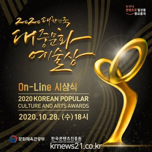 ▲ [사진=홍보포스터]대중문화예술 분야 최고 권위의 정부 포상인 ‘2020년 대한민국 대중문화예술상’ 시상식이 10월 28일(수) 오후 6시 온라인으로 열린다. 시상식은 한국콘텐츠진흥원 유튜브 채널과 네이버 브이라이브에서 생중계되며, 11월 1일(일) 오후 6시 에스비에스 엠티브이(SBS MTV) 채널에서도 방송된다.