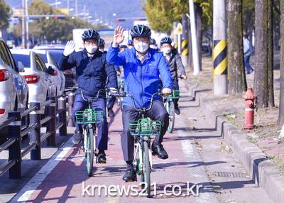 이용섭 시장은 시민들과 함께 직접 자전거를 타고 월전공원에서 평동역까지 이동하며 자전거도로 여건을 살핀 뒤 평동역에서 생활형 자전거도로에 대한 시민의견을 경청했다.
