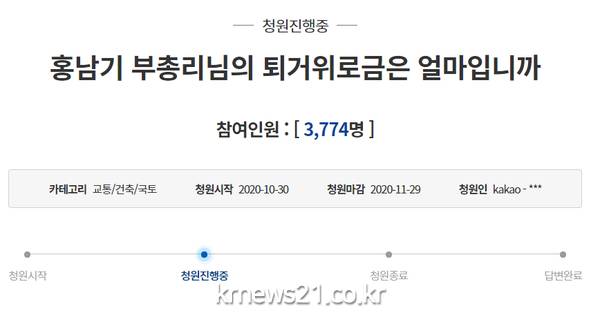지난달 30일 청와대 국민청원 게시판에는 ‘홍남기 부총리님의 퇴거위로금은 얼마입니까’라는 제목의 청원 글이 올라왔다.