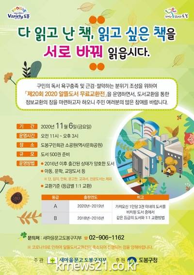 ▲ [사진=홍보포스터]도봉구(구청장 이동진)는 오는 11월 6일, 도봉구민회관 창동역사문화공원에서 ‘2020 알뜰도서교환전’을 연다. 구민들의 독서 욕구를 해소하고 나눔 문화와 책 읽는 분위기 조성을 위해서다.