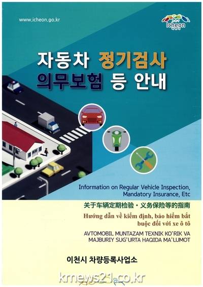 ▲ [사진=홍보포스터]이천시(시장 엄태준)는 관내에 거주하는 외국인 중 차량을 등록한 839명에게 자동차종합(정기)검사 및 의무보험 미가입 운행 예방을 위해 우리말 이외의 4개 언어로 번역된 정보(영어, 중국어, 베트남어, 우즈베크어)를 담은 홍보전단을 배부했다.