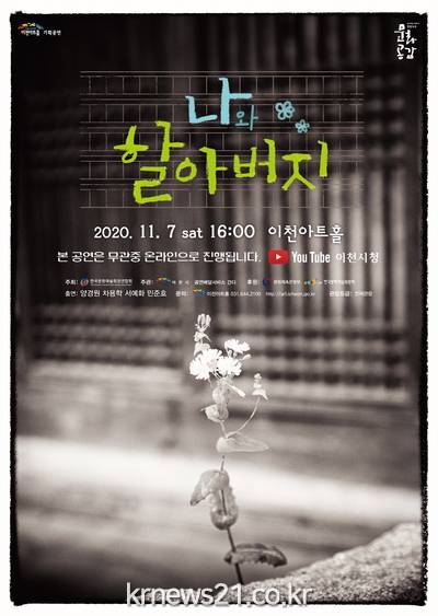 ▲ [사진=홍보포스터]이천아트홀은 오는 11월 7일(토) 16시 ‘2020년 문예회관과 함께하는 방방곡곡 문화공감사업’의 일환으로 진행되는 극단 ‘공연배달서비스 간다’의 대표작 중 하나인 연극 ‘나와 할아버지’를 이천시청 공식 유튜브 채널(https://www.youtube.com/user/2000ishappy)을 통해 선보인다고 밝혔다.