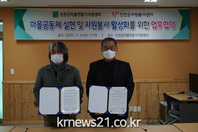 ▲ [사진제공 = 진천군]진천군마을만들기지원센터(센터장 김승근)와 진천군자원봉사센터(센터장 박충서)는 4일 마을만들기지원센터에서 마을공동체 실현 및 자원봉사 활성화를 위한 업무협약을 체결했다.