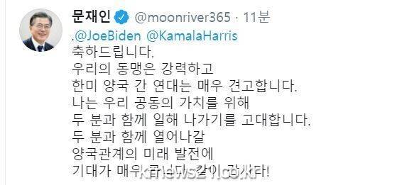 ▲ [이미지출처 = 문재인 대통령 트위터 캡처]문재인 대통령은 조 바이든 미국 대통령 당선인과 카멀라 해리스 부통령 당선인에게 "우리 공동의 가치를 위해 두 분과 함께 일해 나가기를 고대한다"고 축하 메시지를 보냈다.