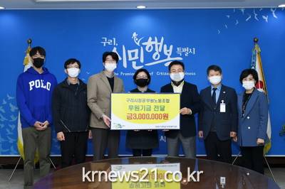 구리시청공무원노동조합(위원장 박운평)은 지난 9일 시청 민원상담실(3층)에서 안승남 구리시장을 비롯하여 구리시청공무원노동조합 박운평 위원장, 이상희 구리시종합사회복지관장 등 관계자들이 참석한 가운데 코로나19 극복을 위한 후원금 300만원을 구리시에 기탁했다.