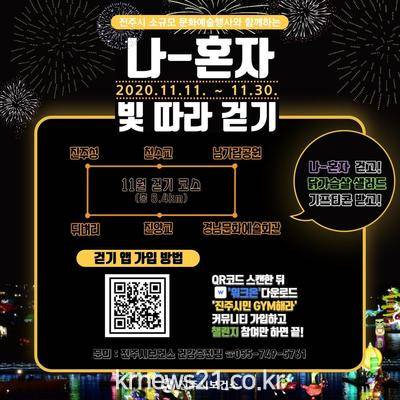 ▲ [사진=홍보포스터]진주시 보건소는 걷기 앱(Walk On)을 활용한 비대면 커뮤니티인 ‘진주시민 GYM해라’에서 오는 11일부터 “나-혼자 빛 따라 걷기” 챌린지를 운영한다.