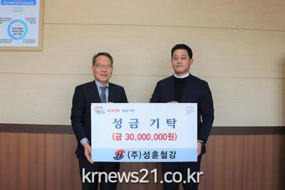 ▲ [사진제공 = 진주시]㈜성훈철강(대표 김성훈)은 지난 9일 주변의 어려운 이웃을 위해 사용해달라며 진주시 복지재단(이사장 이성갑)에 성금 3000만원을 기탁했다.