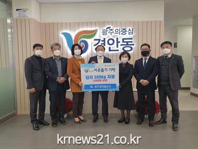 ▲ [사진제공 = 광주시]MG광주새마을금고(이사장 민경남)는 지난 10일 경안동 행정복지센터를 방문, 어려운 이웃에게 전달해 달라며 김치 500㎏(150만원 상당)를 기탁했다.