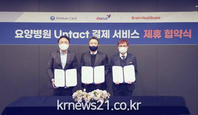 신한카드는 보다 빠른 기간 내에 전국 모든 요양병원에 서비스를 도입하기 위해 10일 경기 성남시 소재 다날 대강당에서 이병철 신한카드 라이프 큐레이션(Life Curation) 팀장, 박지만 다날 본부장, 남기웅 브레인헬스케어 이사 등 관계자들이 참석한 가운데 ‘다날(대표 박상만), ‘브레인헬스케어(대표 이상경)’와 전략적 제휴 협약을 체결했다.