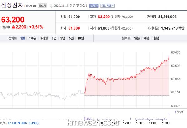 13일 유가증권시장에서 삼성전자 보통주 주가는 전일 대비 3.61% 올라 6만3200원을 기록했다. 지난 1월 20일 이후 최고치다.