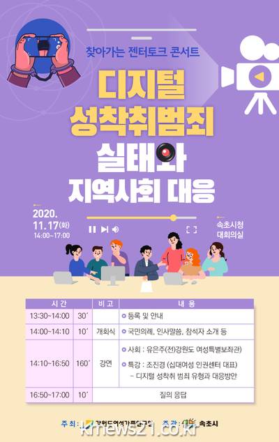 본 행사는 속초시가 2021년도 여성친화도시 지정을 목표로 여성이 안전한 여성친화도시 조성을 위해 디지털 성착취 범죄의 실태와 심각성을 여성친화도시 시민참여단 및 시민들과 공유하고 지역사회 차원의 대응방안을 모색하고자 마련됐다.
