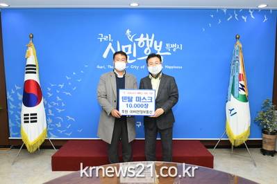 ▲ [사진제공 = 구리시]구리시(시장 안승남)는 지난 16일 시청 민원상담실에서 ㈜비젼정보통신 문병국 대표 등이 참여한 가운데, 후원사인 ㈜비젼정보통신과의 코로나19 재확산 방지를 위한 ‘덴탈 마스크 10,000장 전달식’ 을 진행했다.
