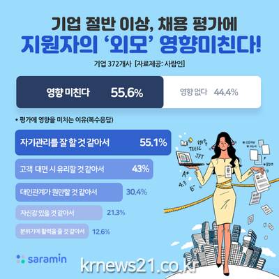 구인구직 매칭플랫폼 사람인(대표 김용환)이 기업 372개사를 대상으로 ‘지원자의 외모가 채용 평가 시 영향을 미치는 지 여부’에 대해 조사한 결과, 절반 이상(55.6%)이 영향을 미친다고 답했다.