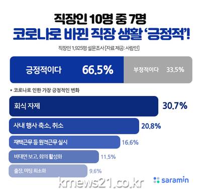 구인구직 매칭 플랫폼 사람인(대표 김용환)이 직장인 1,925명을 대상으로 ‘코로나19로 인한 직장 생활 변화’를 조사한 결과, 66.5%가 ‘긍정적’이라고 밝혀 ‘부정적’(33.5%)이라는 답변보다 두 배 더 많았다.