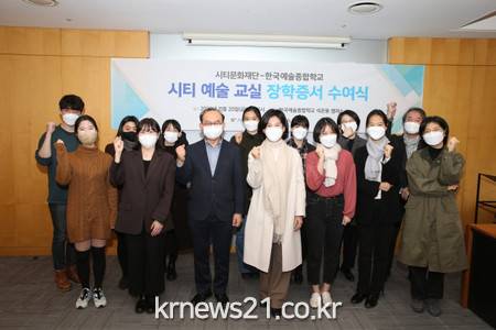 신종 코로나바이러스 감염증(코로나19) 방역 수칙을 준수하며 진행된 이날 전달식에는 시티문화재단 윤지연 이사장과 한국예술종합학교 김봉렬 총장 등 관계자들이 참석했으며 선발된 12명의 장학생에게는 장학증서가 수여됐다.
