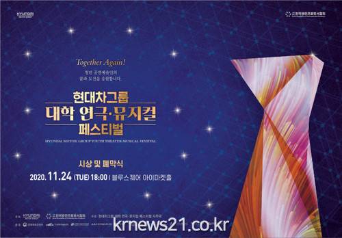 우리나라 공연예술계를 이끌어갈 역량 있는 젊은 공연예술인을 발굴하고, 공연예술 전문 인력 양성을 위해 시작한 전국 규모의 대학생 공연예술 경연대회인 ‘현대차그룹 대학 연극·뮤지컬 페스티벌’의 시상 및 폐막식은 코로나19로 침체된 문화예술계와 청년공연예술인을 다시 빛내기 위한 ‘응원과 희망의 시상식’으로 진행되며, 공연예술계 원로배우를 포함해 뮤지컬 스타들이 문화예술계와 청년 공연 예술인들에게 띄우는 릴레이 응원 영상 편지가 공개될 예정이다.